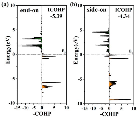 Projected crystal orbital Hamilton population (pCOHP) between Mo and the N atoms of the adsorbed N2 via (a) end-on and (b) side-on configurations, where the right and left parts represent bonding and antibonding contributions, respectively.