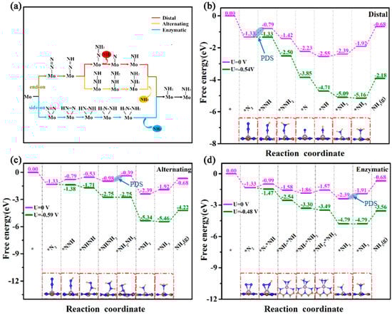 (a) Schematic illustration for three reaction pathways for NRR. Free energy diagrams for N2 reduction NH3 on Mo@g-C9N10 via (b) distal, (c) alternating, and (d) enzymatic pathway, where inserts represent the fully optimized configurations for reaction intermediates.