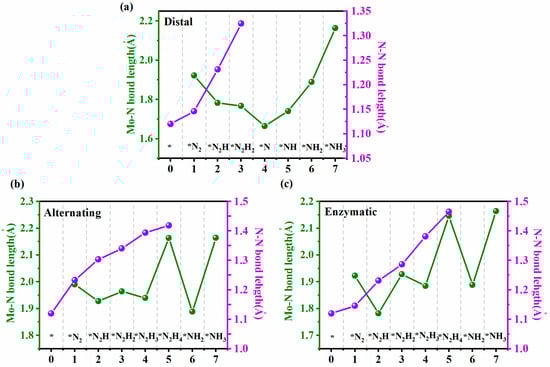 The Mo-N and N-N bond length fluctuation for Mo@g-C9N10 during N2 reduction process through (a) distal, (b) alternating, and (c) enzymatic pathways. The * represents the substrate binding site. The * of intermediates represent species chemisorbed to the substrate binding site.