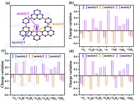 (a) Schematic diagram of the definition of three moieties for Mo@g-C9N10 with the adsorbed NxHy species and their charge variation of three moieties along (b) distal, (c) alternating, and (d) enzymatic pathways. The * of intermediates represent species chemisorbed to the substrate binding site.