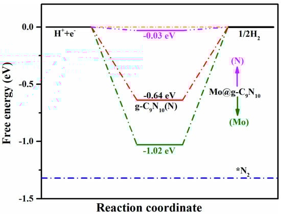 Calculated Gibbs free energy diagram of H atom and N2 molecule adsorbed on the Mo@g-C9N10 matrix. *N2 represents N2 molecule chemisorbed to the substrate binding site.