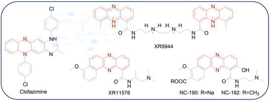 There have been many biological investigations related to natural and synthtic phenazines that demonstrate therapeutic value related to human health and disease. Phenazinomycin isolated from Streptomyces sp. WK-2057 bears a cyclic terpenoid appendage. The compound shows moderate antibacterial activity against Staphylococcus aureus and direct cytotoxic activities against HeLa S3, P388, and P388 doxorubicin-resistant cells. In addition, phenazinomycin demonstrated antitumor activity against experimental murine tumors (Sarcoma 180 cells) in vivo, resulting in a prolongation of survival time for tumor-bearing mice (up to 140%) [101]. Iodinin (11) demonstrated that hypoxia-selective antileukemia activity (EC50 = 2.0 μM against normoxic cells, EC50 = 0.79 μM against hypoxic cells) has the potential to act on malignant cells in hypoxic bone marrow of AML patients [46]. The halogenated phenazine natural product, 2-bromo-1-hydroxyphenazine (78) with an MIC = 6.25 μM, is significantly more potent than pyocyanin (MIC = 50 μM). Synthetic halogenated phenazine compounds HP 1 (MIC = 1.56 μM) and HP 29 (MIC = 0.08 μM) have potent antibacterial activity and are able to eradicate bacterial biofilms. HP 29 has demonstrated especially good efficacy in dorsal wound infection models in mice [102]. Clofazimine has been received FDA approval to treat lepromatous leprosy (caused by Mycobacterium leprae) in 1986 and is on the World Health Organization’s (WHO) model list of essential medicines [103,104]. XR11576 is an oral topoisomerase I and II inhibitor, and bis-phenazine XR5944 is a novel cytotoxic agent that intercalates into DNA and inhibits transcription [105,106]. These two compounds have been under phase I clinical testing. NC-182 is a novel antitumor compound with a benzo-[a]phenazine ring. It is a potent DNA intercalator with nearly the same binding ability as daunomycin; however, the mode of interaction of NC-182 with DNA depends on the concentration of the drug, where the intercalative and electrostatic bindings are dominant at low and high concentrations of the drug, respectively [107]. NC-190 has been shown to induce topoisomerase II-dependent DNA cleavage and DNA fragmentation. The compound demonstrates anticancer activity against multiple cancer cell lines in vitro and in vivo (tumor models in animals), and the activities against HL-60 cells in a dose-dependent manner were comparable to that of etoposide, which is a clinically used cancer therapy [108,109].