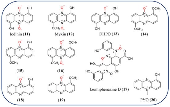 The two most common types of post-modification in natural phenazines are hydroxylation and hydroxy-methylation. Ten hydroxylated and O-methylated phenazines (3–10, 03, 08) are summarized in this review (Figure 2). 1-Hydroxyphenazine (3) and 2-hydroxyphenazine (4) with a single hydroxyl, 1,2-dihydroxyphenazine (5), and 1,6-dihydroxyphenazine (6) carry two hydroxyl groups at different positions, and 1-carboxyl-6-formyl-4,7,9-trihydroxy-phenazine (CFTHP, 7) bearing three hydroxyl groups at 4,7,9 position have all been reported as phenazine hydroxylation products [33]. They are mostly present in Streptomyces spp., Pseudomonas spp., Rhodococcus spp., Sphingomonas wittichii, Lysobacter antibioticus, and Xenorhabdus szentirmaii, and can inhibit Aeromonas hydrophila, Fusarium oxysporum, Rhizoctonia solani, Pythiumultimum, Alternaria alternata, Alternaria solani, Colletotrichum acutatum, Curvularia andropogonis, Fusarium moniliforme, Pythium aphanidermatum, and tumor cells [34,35,36,37,38,39]. Compound 4 was reported to possess a better inhibitory effect on the take-all disease of wheat than PCA [40]. Two O-methylated phenazines compounds 1,6-dimethoxyphenazine (8) and 1-hydroxy-6-methoxyphenazine (9) were isolated from Lysobacter antibioticus OH13 with weak antibacterial activity [39]. Further, 1-methoxyphenazine (03) and methyl-6-methoxyphenazine-1-carboxylate (08) were isolated from Streptomyces luteireticuli NIIST-D75, and both compounds were shown explicitly in elaborate in vitro experiments as potentiators of ciprofloxacin for antibacterial activity with highly reduced dosage [41]. Strepphenazine A (10), which contains hydroxyl, carboxyl, and methoxyl groups, has been detected in the culture broth of Streptomyces strain YIM PH20095, showing antifungal activity against Fusarium oxysporum, Plectosphaerella cucumerina, Alternaria panax, and Phoma herbarum, which prevented root-rot disease in Panax notoginseng with minimal inhibitory concentrations of 16–32 μg/mL [42]. This study shows that Streptomyces strain YIM PH20095 provides new sources for the development of biological control agents to prevent the infection of pathogenic fungi of P. notoginseng. Although O-methylated natural products are very common, the O-methylation is important for the antibiotic activity of phenazines. For example, compound 03 has much higher antifungal activity against Bipolaris maydis, Alternaria solani, and Aspergillus flavus than compound 3 [43]. Besides that, the antimicrobial activity of myxin (12) is also much higher than iodinin (11) (Figure 3) [44].