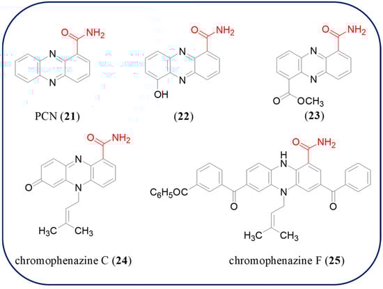 Compounds 21–25 are carboxamidated phenazines described in this review (Figure 4). Phenazine-1-carboxamide (PCN, 21) is mainly isolated from Pseudomonas, Streptomycetes, Nigrospora oryzae, and Pantoea agglomerans [58,59,60]. PCN exhibits antagonistic activities against a wide range of plant pathogenic fungi Fusarium oxysporum f. sp. niveum (causing fusarium wilt), Fusarium graminearum (causing fusarium head blight), and Rhizoctonia solani (causing rice sheath blight), etc. [61,62], as well as inhibitory effect on different cancer cell lines A549, HeLa, and SW480 between the concentration of 32 and 40 μM [63]. There was research that showed that PCN secreted by a bacterium Pseudomonas piscium ZJU60 from the wheat head directly manipulates the activity of the plant pathogenic fungus Fusarium graminearum histone acetyltransferase domain of FgGcn5 and suppresses fungal virulence, growth, and mycotoxin biosynthesis [64,65]. As a result, it provided a unique example that an antagonistic microbe could inhibit the virulence and growth of a plant pathogenic fungus by affecting its histone modification. PCA amide is a promising skeleton for designing more potent phenazine-based fungicides. 6-Hydroxyphenazine-1-carboxamide (22), methyl 6-carbamoylphenazine-1-carboxylate (23), chromophenazine C (24), and chromophenazine F (25) are four novel phenazine derivatives with carboxamide moiety obtained from Streptomycetes [66,67]. Compounds 22 and 23 exhibit moderate antifungal and antibacterial activities against Fusarium oxysporum (ATCC 7808), Fusarium solani (ATCC 36031), Staphylococcus aureus (ATCC 25923), and Staphylococcus albus (ATCC 10231), respectively [67]. However, the novel complicated compounds 24 and 25 did not show any activity against B. subtilis, E. coli, M. miehei, S. aureus, and C. albicans [66]. Further investigation on the bioactivity of compounds 22–25 needs to be undertaken in the future.