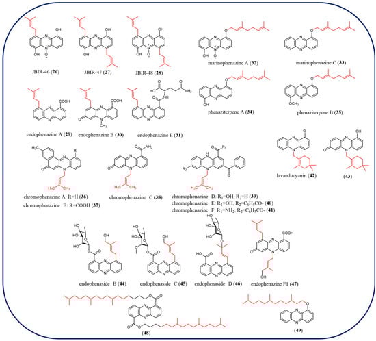 Terpenoid phenazines are a large class of compounds and contain common structural features of isoprenylated C, N, and O side chains or complex structures. In this review, 24 terpenoid phenazines (26–49) are summarized (Figure 5). However, most terpenoid phenazines exhibit moderate or weak antibacterial activity. A series of prenylated phenazine compounds have been discovered in Streptomyces. For instance, C-prenylated phenazines, including JBIR-46 (26), JBIR-47 (27), JBIR-48 (28), endophenazine A (29), endophenazine B (30), and a novel phenazine, endophenazine E (31), which represents a glutamine α-amino attached to the carboxyl group of endophenazine A. Compounds 29, 30, and 31 show antimicrobial activity against the Gram-positive Bacillus subtilis and Gram-negative E. coli [68]. Compounds 32–35 are O-prenylated phenazines and phenazines 36–43 are N-prenylated derivatives [69,70,71]. According to the result of the test, marinophenazine A/C (32–33), phenaziterpene A (34), and phenaziterpene B (35) had no discernable biological activity [72]. Only chromophenazine D (42) demonstrated moderate effectiveness against bacteria among the six N-prenylated phenazines, chromophenazines A–F (36–41) [66]. Lavanducyanin (42) and its congener 1-hydroxy-7-oxolavanducyanin (43) isolated from Streptomyces show intriguing cytotoxic activities [73]. Antibacterial assays revealed that 43 had significant but reduced anti-Gram-positive bacterial activity compared with 42, and both compounds were all inactive against Gram-negative bacteria [73]. Endophenaside B (44), endophenaside C (45), endophenaside D (46), and endophenazine F1 (47), which possess substantial antimicrobial activities, were isolated from Kitasatospora sp. [68]. Compounds 48 and 49, with terpenoid aliphatic chains at positions 1 and/or 6 of the phenazine ring, were identified in the Pseudomonas aeruginosa strain RRLJ 04 culture [74]. The strain exhibited growth promotion and disease control in pigeon peas, both compounds 48 and 49 showed in vitro antibiosis against Fusarium udum and can be further exploited for growth enhancement and disease control of other crops.