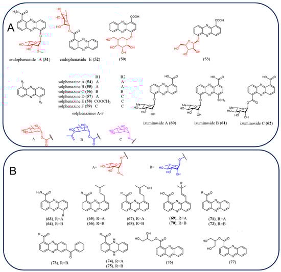 The increasing bacterial multi-drug resistance necessitates novel drug-discovery efforts. One way of obtaining novel chemistry is the decoration of molecules by glycosylation because the pharmacological properties of the parent scaffold can be dramatically influenced by glycosylation, such as in anthracycline, avermectin, aureolic acid, and enediyne antibiotics [75]. Glycosylation is a common modification of natural phenazine products with high diversity in both the sugar moieties and the targeted aglycones. A total of 28 glycosylated phenazines (50–77) and their activities are described in this literature (Figure 6A,B). Compound 4-O-glucosyl-1-carboxyl-phenazine (50) from Streptomyces sp. strain UICC B-92 exhibited inhibitory potency against Gram-positive bacteria B. cereus strain ATCC 10876 and S. aureus strain ATCC 25923 [76]. A number of novel glycosylated phenazine-type antibiotic endophenasides A–E (51, 44, 45, 46, 52) were produced by Kitasatospora sp. MBT66 [68]. Endophenaside A (51) and endophenaside C (45) are phenazines that contain a rare 2′-O-methylation of the sugar moiety. Endophenasides A–E showed antimicrobial activity against the Gram-positive Bacillus subtilis or Gram-negative E. coli [68]. Nannocystis pusilla strain Ari7 has been demonstrated to produce 1,6-dihydroxyphenazine glycosylated derivative, 1-hydroxyphenazine-6-yl-α-D-arabinofuranoside (53) [77]. Novel glycosylated phenazine products solphenazines A–F (54–59), along with izuminosides A–C (60–62), were isolated from Streptomyces sp. strain DL-93 and IFM 11260, respectively. Compounds 54–59 did not show any antifungal or antibacterial activity; however, 54, 55, and 59 displayed some cytotoxicity against HCT-116 cancer cells (Figure 6A), the cytotoxicity was not associated with DNA intercalations and topoisomerase inhibition and the mechanisms of action were uncertain [78]. Compounds 61 (10 μM) and 62 (60 μM) in combination with TRAIL showed synergistic activity in sensitizing TRAIL-resistance AGS cells. 2′-O-methylated/2′-O-unmethylated rhamnose glycosylated phenazines and two tautomeric glyceride naturally occurring phenazine products (63–77) were characterized in Kitasatospora sp. MBT66 fermentation broth (Figure 6B) [79]. As described above, most glycosylated phenazine natural products do not have remarkable activity, and the activities of glycosylated phenazines need to be further investigated.