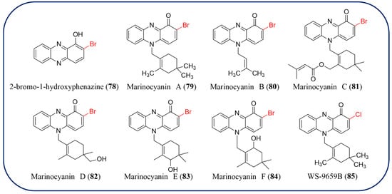 Halogenated phenazine natural products are rare in nature, and their biosynthetic pathways have not been discovered. The halogenated phenazines are 2-bromo-1-hydroxyphenazine (78) from Streptomyces sp. CNS284 showed strong cancer cell cytotoxicity (IC50 = 0.1 μM against HCT-116) and weak to moderate activity in the NF-κB-luciferase assay (IC50 = 73 μM) [83]. Six brominated phenazines, marinocyanins A–F (79–84), that have strong to weak cytotoxicity against HCT-116 human colon carcinoma and possess modest antimicrobial activities against Staphylococcus aureus and Candida albicans were obtained from Streptomyces with the lavanducyanin chlorinated analog WS-9659B (85) (Figure 7) [84]. Up to now, there have been no reports on fluorinated or iodinated phenazine natural products. But a novel series of halogenated phenazines has been developed by chemical synthesis methods due to their potent antibacterial and biofilm eradication activities against critical Gram-positive pathogens, including Staphylococcus aureus, Staphylococcus epidermidis, and Enterococcus faecium [85,86]. These compounds have the potential to dramatically impact future therapies related to biofilm-associated infections.