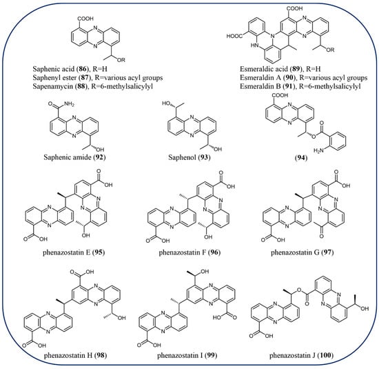 Microorganisms are a rich source of structurally unique bioactive metabolites and drug candidates. Saphenic acid (6-(1-hydroxyethyl) phenazine-1-carboxylic acid, 86) isolated from Streptomyces, is a common pharmacophore for many antibiotics and antitumor reagents including DC-86-M and phenazostatins [87]. Moreover, its derivatives such as saphenyl ester (87), saphenamycin (88), esmeraldic acid (89), esmeraldin A (90), and esmeraldin B (91) are present in the metabolites of Streptomyces [87]. In particular, marine microbes from the deep sea are a relatively untapped reservoir of metabolites with structural and biological diversity waiting to be discovered. For example, saphenic amide (92), saphenol (93), 6-[1-(2-aminobenzoyloxy) ethyl]-1-phenazinecarboxylic acid (94), phenazostatins E-J (95–100) were isolated from the culture broth of marine yeast-like fungus Cystobasidium laryngis derived from deep-sea sediments of the Indian Ocean Ridge (Figure 8) [31,88,89]. Compounds 92 and 93 showed a nitric oxide (NO) production-inhibitory effect against lipopolysaccharide (LPS)-induced murine macrophage RAW 264.7 cells without cytotoxicity at concentrations up to 30 µg/mL. Moreover, diphenazine phenazostatin J (100) exhibited significant antineuroinflammatory activity with an IC50 value of 0.30 μM and cytotoxicity against the NUGC-3 (stomach) cell line with an IC50 value of 7.7 nM, exhibiting 19-fold stronger activity than adriamycin. Interestingly, 100 demonstrated stronger cytotoxicity than its oxidized form (R)-6-(1-((6-acetylphenazine-1-carbonyl)oxy)ethyl) phenazine-1-carboxylic acid and positive control, indicating that the ester linkage and the hydroxyethyl group attached to the phenazine scaffold are essential for the activities [88]. Compound 100 could be a potential agent for the development of antineuroinflammatory and anticancer leads, and the underlying mechanisms for the biological activities and the structure–activity relationship are needed for further study.
