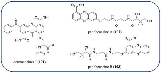 The four phenazines with sulfur (61, 101–103) are introduced in this review (Figure 9). Izuminoside B (61), the phenazine with a C-4 coupled methylsulfanyl group at the para-position to carboxylic acid has been obtained from Streptomyces sp. IFM 11260 [90]. The activity of compound 61 has been described in Section 2.7. Compound dermacozines J (101) isolated from Dermacoccus abyssi has been established to have an N-acetylcysteine moiety attached to C-9, and it demonstrated radical scavenging activity [91]. Panphenazine A (102) and B (103) were characterized by actinomycete Kitasatospora sp. HKI 714 as unusual pantetheine-containing phenazines, which were proposed to be synthesized by radical-induced conjugate addition [92]. This study indicated that phenazines possess the ability to capture biogenic thiols, crosslink proteins, and, ultimately, contribute to protein degeneration/aggregation processes.
