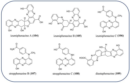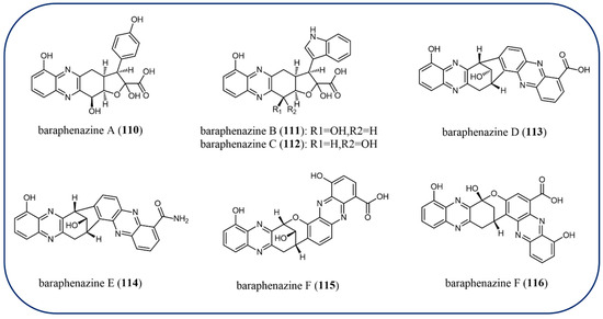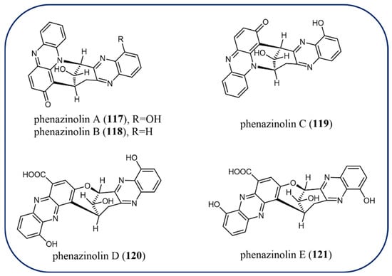 Recently, phenazine natural products with a wider range of structural variations (104–150) have been identified from microorganisms. Red solids phenazines izumiphenazines A–C (104–106) were isolated from Streptomyces, and izumiphenazine A (104) is the first instance of tetrahydrofuran ring connected phenazine dimer [93]. Compounds 104–106 were evaluated to have a synergistic effect in combination with TRAIL (TNF-related apoptosis-inducing ligand) against AGS cells. Izumiphenazine C (106) analogs strepphenazine B–C (107–108) have been characterized by Streptomyces with antifungal activities [42]. A novel dimeric phenazine, diastaphenazine (109), was also obtained from the fermentation broth of Streptomyces (Figure 10). Compound 109 has antibacterial activity against S. aureus but is inert against E. coli and C. albicans, according to the antimicrobial test [94]. Among the seven new phenazine-based metabolites—baraphenazines A–G (110–116) (Figure 11)—compounds 104–106 represent the first reported examples of fused 5-hydroxyquinoxaline/alpha-keto acid-based moiety [95]. Furthermore, baraphenazines D (113) and E (114) present two new diastaphenazine-type C-C-fused phenazine-based congeners, while baraphenazines F (115) and G (116) are two phenazinolin-type C-O-fused compounds. Only baraphenazines E (114) exhibited significant activity in antibacterial and fungal tests at the doses studied. A tin mine tailings-derived Streptomyces was found to create a novel family of diphenazines known as phenazinolins A–E (117–121). Phenazinolins A–C (117–119) exhibited amazing violet color and antagonistic activity for Bacillus subtilis, Staphylococcus aureus, Aspergillus niger, and Botrytis cinerea with MIC values in the range of 12–27 μM. The IC50 values of compounds 117–119 in vitro cytotoxicity against GLC, P388, XWLC, and H460 human cancer cell lines were in the range of 14–40 μM (Figure 12) [96,97].
