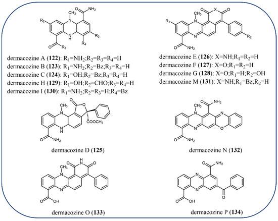 A series of new phenazine-type pigments dermacozines A–J (122–130, 101) and dermacozines M–P (131–134) were discovered in the fermentation media of Dermacoccus abyssi sp. strains isolated from Mariana Trench sediment (Figure 13) [98]. Dermacozine N (132) is the first linear pentacyclic oxazinophenazine natural product discovered [99]. This chemical family of compounds showed a low cytotoxic effect against resistant cancer cell lines. Dermacozines F (127) and G (128) displayed the most potent cytotoxic activity. Dermacozine C (124) had the strongest radical scavenging ability.