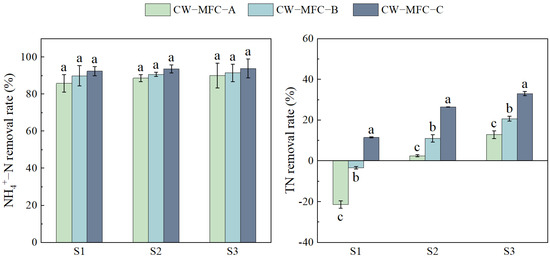 NH4+−N and TN contents in the effluent of different CW-MFC system configurations. Different lowercase letters indicate significant differences between the treatments (p < 0.05).