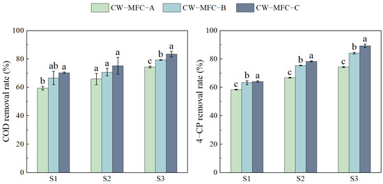 Removal rates of COD and 4-CP in the effluent of different CW-MFC system configurations. Different lowercase letters indicate significant differences between the treatments (p < 0.05).