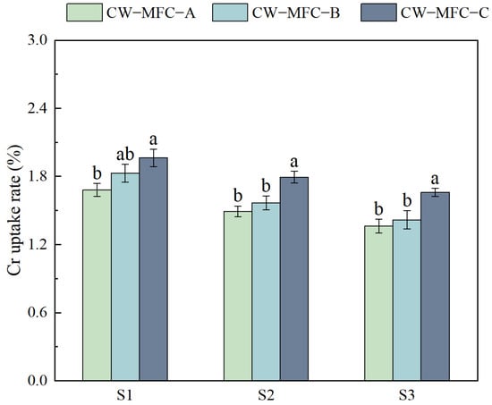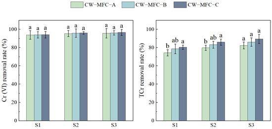 Figure 3 shows the enhanced removal rates of Cr (VI) and total chromium (TCr) with an extended HRT. However, Cr (VI) removal rates and TCr removal rates showed no significant differences. Compared to CW-MFC-A and CW-MFC-B, CW-MFC-C exhibited the highest removal efficiency for Cr. The Cr (VI) in effluent did not reach the standard value (<0.05 mg·L−1), and the TCr in effluent did not reach the standard value (<0.1 mg·L−1).