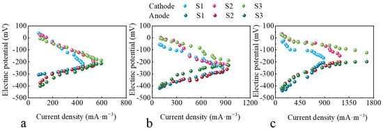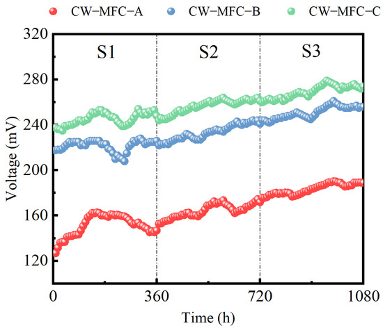 Figure 4 illustrates the recovery and rise in output voltages of the three CW-MFC configurations with an extended HRT, albeit with fluctuations. During S3, compared to S1, the peak output voltages reached 189.4, 261.0, and 279.1 mV, representing increases of 16.2%, 14.4%, and 9.9%. From S2 to S3, the maximum output voltage of CW-MFC-A, CW-MFC-B, and CW-MFC-C was improved by 8.54%, 6.97%, and 5.72%, respectively. While CW-MFC-A showed the greatest enhancement in maximum output voltage, CW-MFC-C demonstrated the best overall electricity generation performance. When the HRT is short, the rapid water current swiftly removes organic matter essential for EABs, hindering their normal reproduction and electricity generation. Furthermore, some organic matter is not completely degraded and reaches the cathode, fostering microbial growth that competes in the O2 reduction reaction, thereby diminishing the electricity generation performance. Additionally, the incomplete consumption of dissolved oxygen in the anode region inhibits bacterial activity to some extent [61,62]. As the HRT increases, the contact time between EABs and organic matter lengthens, facilitating greater electron generation from organic matter degradation and thereby enhancing the system’s voltage output [63].