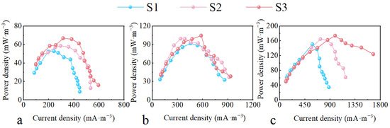 Power density curve of different CW-MFC system configurations. (a) CW-MFC-A; (b) CW-MFC-B; (c) CW-MFC-C.