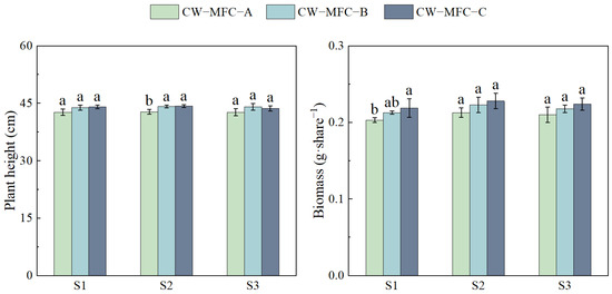 Plant height and biomass of L. hexandra. Different lowercase letters indicate significant differences between the treatments (p < 0.05).