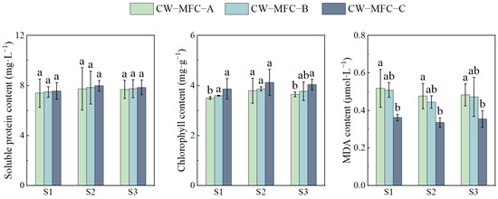 Figure 8 shows the trends of soluble protein and chlorophyll content increases, alongside a decrease in MDA content in leaves with an extended HRT in CW-MFC systems. The chlorophyll content and MDA content showed significant differences, and soluble protein content showed no significant difference, which may be caused by the better chromium removal in each reactor and the lower chromium stress on L. hexandra. S2 exhibited the most substantial changes, with chlorophyll increasing by 8.60%, 7.80%, and 6.72%, and MDA decreasing by 7.69%, 9.80%, and 8.69%, compared to S1.