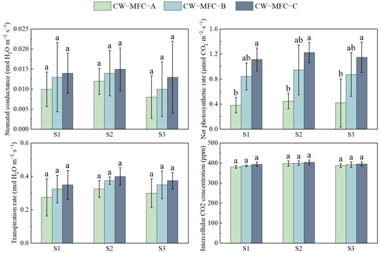 Figure 9 shows that photosynthesis parameters of L. hexandra peaked during S2 across all reactors. The net photosynthetic rate showed significant difference, but stomatal conductance, transpiration rate, and intercellular CO2 concentration showed no significant difference, which may be caused by the better removal of pollutants from all the reactors, and L. hexandra suffered from a low level of stress in all reactors. Plant photosynthesis is typically constrained by various factors. Some studies have suggested that plant photosynthesis may be predominantly influenced by stomatal limitations in L. hexandra [76,77], while the potential influence of non-stomatal factors cannot be disregarded [78]. In the present experiment, photosynthesis is likely influenced by both stomatal and non-stomatal factors.