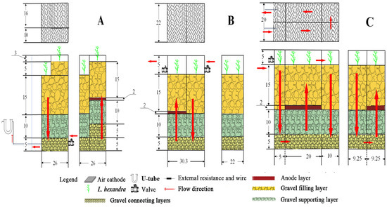 Three different configurations of CW-MFC reactors were constructed using Plexiglas. Each reactor had a body wall of 5 mm thickness, (20.37 ± 0.27) L reactor volume, and (6.12 ± 0.10) L effective volume. The CW-MFC-A, CW-MFC-B, and CW-MFC-C adopt stacked, multistage, and modular configurations, respectively, as shown in Figure 11. Synthetic wastewater flows in each CW-MFC reactor following the direction of the arrows in the figure and eventually overflows from each reactor.
