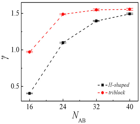In order to investigate the effects of polydispersity of the arms affect the efficiency of H-shaped polymers, we perform simulations at various arms length of the H-shaped block copolymers with NAB = 24 and cAB = 0.15 (Figure S2). Table 1 shows the interfacial tension of the blends with various arms length of the H-shaped block copolymers. It is found that the symmetric H-shaped copolymer was more effective in reducing the interfacial tension of A8/B8 blends than the asymmetric H-shaped copolymer. This result is supported by the extensive studies [43,44,45]. Compared with an H-shaped copolymer with each end having one arm that is longer than the second [S4 and S5 of the Figure S2], an H-shaped copolymer with arm length at one end being shorter than the other [S2 and S3 of the Figure S2] was less efficient in compatibilizing A8/B8 blends. And the more asymmetrical the H-shaped copolymer, the lower its capacity enhancement efficiency.