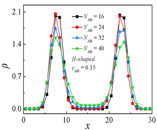 Density profiles of beads A + B of the H-shaped block copolymer along the x-axis as a function of molecular weight of the H-shaped block copolymer at the copolymer concentration of cAB = 0.15.