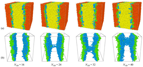 Furthermore, Figure 4 reveals that the central beads B of the H-shaped block copolymers exhibit a preference for segregation close to the B8 homopolymer bulk phase, while the end beads A of the H-shaped block copolymers tend to segregate close to the A8 homopolymer bulk phase. As NAB = 16, there is only a loop conformation in the blends. The loop conformation is characterized by the folding of the copolymer onto itself, with its branches localized within a single interface. With molecular weights NAB = 24, 32, 40, the predominant structural alteration observed in H-shaped block copolymers is the emergence of bridge polymer conformations. The bridge conformation is extended and forms spanning networks between the interfaces. Figure 4 illustrates that majority of H-shaped block copolymers adopt a loop conformation at the interface. In contrast to diblock copolymers, this loop configuration results in a reduction in mixing entropy and interfacial tension, thereby enhancing interface stability [28]. Additionally, Figure 4 highlights that the segregation behavior of H-shaped copolymers in blends is markedly influenced by the molecular weight of the H-shaped block copolymers. Specifically, as the molecular weight of the H-shaped block copolymers increases from NAB = 16 to 40, a corresponding increase in the density of beads B within the homopolymer bulk B8 is observed (refer to Figure 4).