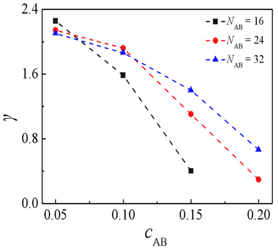 We conducted additional investigations into the impact of the concentration of H-shaped block copolymers, denoted as cAB, on interfacial properties. Figure 6 illustrates the interfacial tension of the ternary blends relative to the concentration of H-shaped block copolymers, cAB. The interfacial tension exhibits a decrease with increasing concentration of H-shaped block copolymers cAB. These results are substantiated by the experimental observations of Retsos et al. [46]. We also observe that, at a low concentration of H-shaped block copolymers, cAB = 0.05, the interfacial tension exhibits a higher value. Conversely, as cAB increases from 0.1 to 0.15, the interfacial tension shows a lower value for the H-shaped copolymer with NAB = 16. This also suggests that the low molecular weights of H-shaped block copolymers demonstrate enhanced efficacy in reducing the interfacial tension of the blends.