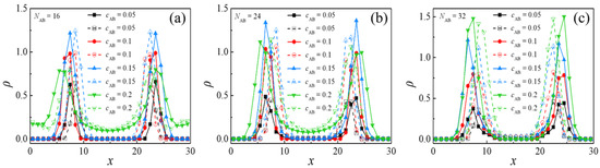 Density profiles of beads A and B of the H-shaped block copolymer along the x-axis as a function of the H-shaped block copolymer concentration: (a) NAB = 16, (b) NAB = 24, and (c) NAB = 32.