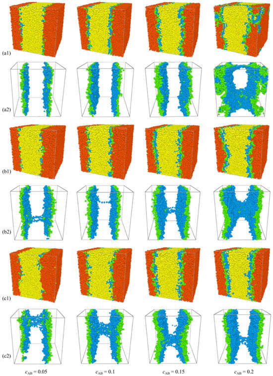 Figure 7a–c present the simulated density profiles of beads A and B within H-shaped block copolymers possessing NAB values of 16, 24, and 32, respectively, as a function of cAB. Consistent with the observations in Figure 7a–c, Figure 8 illustrates morphology snapshots of ternary blends. For the case of NAB = 16, the escalation of cAB from 0.05 to 0.15 precipitates a discernible increase in the densities of beads A and B of the H-shaped copolymer in proximity to the interface center, as evidenced in Figure 7a. This phenomenon is characterized by the collective enrichment of all H-shaped block copolymers at the interface, thereby precluding segregation within the bulk of homopolymers and ensuring the interface consistently maintains planarity, as depicted in Figure 8(a1,a2). As cAB further increases from 0.15 to 0.2, a pronounced reduction in the densities of beads A and B near the interface center is observed, as illustrated in Figure 7a. Concurrently, the segregation of the H-shaped copolymer within the bulk of homopolymers A8 and B8 intensifies interface saturation with a change in the interfacial geometry, as illustrated in Figure 8(a2). In the case of NAB = 24, the augmentation of H-shaped copolymer concentration from cAB = 0.05 to 0.15 induces a marked increase in the densities of A and B beads of the H-shaped block copolymers (depicted in Figure 7b) at the interface, while the interface remains consistently planar (illustrated in Figure 8(b1,b2)), with the emergence of a few copolymers adopting bridge conformations. Subsequently, as the H-shaped copolymer concentration escalates from cAB = 0.15 to 0.2, a conspicuous decrease in the densities of A and B beads (depicted in Figure 7b) near the interface center is observed, coinciding with an intensified segregation of the H-shaped copolymer within the bulk of homopolymer B8. Nevertheless, for the case of NAB = 32, as the concentration of the H-shaped copolymer escalates from cAB = 0.05 to 0.2, there is a notable augmentation in the densities of the A and B moieties of the H-shaped copolymer at the interface, as depicted in Figure 7c. Remarkably, the presence of the bridge conformation is observed across all concentrations; however, at cAB = 0.2, there is a notable decrease in the number of bridge conformations.