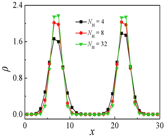 Density profiles of beads A + B of the H-shaped block copolymer along the x-axis as a function of the homopolymer chain length at the (A2)2B8(A2)2 copolymer concentration of cAB = 0.15 NH (NH = 4, 8, 32).