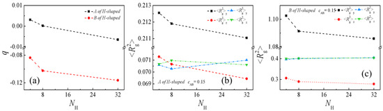 Finally, we calculate the orientation parameter q and the mean-square radius of gyration <Rg2> (as well as <Rg2>x, <Rg2>y, <Rg2>z) of the H-shaped block copolymers at different homopolymer chain lengths in Figure 11a–c. Figure 11a–c depict the chain orientation parameter q and the dimensions of the H-shaped block copolymers as functions of the homopolymer chain length NH. Our results reveal that, as the homopolymer chain length increases from NH = 4 to 32, the chain orientation parameters q initially exhibit a rapid decrease followed by a slower decline (Figure 11a). This trend suggests that the A and B blocks of the H-shaped block copolymers undergo greater extension in the x-direction, perpendicular to the interface, at shorter homopolymer chain lengths. Figure 11b,c illustrate that both the mean-square radii of gyration <Rg2> and the x-component of <Rg2> (<Rg2>x) for the copolymer blocks decline sharply as the homopolymer chain length NH increases from 4 to 8. However, as NH continues to increase from 8 to 32, the rate of decline becomes gradual. Our investigation also reveals that, with an increase in NH, the y and z components of B blocks (y and z denoting directions parallel to the interface) of <Rg2> remain relatively stable, exhibiting almost no change. The observed trend in the mean-square radii of gyration and the three components of H-shaped block copolymers is consistent with the chain orientation parameter q. The findings suggest that shorter chain lengths of homopolymers lead to increased stretching of H-shaped block copolymers along the x-direction, which is perpendicular to the interface. Additionally, the broader distribution of A + B within the H-shaped block copolymers, as depicted in Figure 9, contributes to higher values of q, <Rg2> and <Rg2>x for these copolymers.