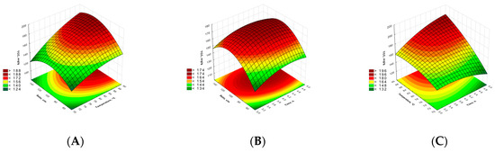 The statistical analysis of TCC revealed a significant positive linear impact of all variables, along with negative quadratic effects. The interaction effect of X12 (time and temperature) was discovered to be significant, while the interaction effect of X13 (time and soli/liquid ratio) was found to be nonsignificant. Lastly, the interaction effect of X23 (temperature and solid/liquid ratio) was found to be significant. The ANOVA results for the examined response variable presented in Table S1 (Supplementary Materials) indicate that the model parameters can account for the experimental variation in the response variables.