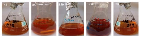 Five bacterial strains coded as LGO5, CH1, 46, 10, and 360 were cultured, and their filtrates were tested for the ability to biosynthesis iron oxide nanoparticles. The biosynthesis process was principally observed through a visible color change, where the color of the reaction mixture changed from a yellowish color to a dark brown, which indicates the formation of iron oxide nanoparticles, suggesting that specific strains have the potential to biosynthesize these nanoparticles efficiently. Further analysis and characterization of the produced nanoparticles will give useful insights into their compatibility for possible biotechnological applications (Figure 2).
