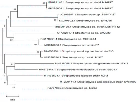 Identification of the most potent bacterial strain was accomplished by sequencing the 16S rRNA gene. The DNA obtained from the isolate was isolated, identified, and compared to other known sequences in the GenBank database using the BLAST program. This was performed to calculate the similarity score and statistical significance of the matches. The BLAST online platform can be found at https://blast.ncbi.nlm.nih.gov/Blast.cgi accessed on 1 July 2023, and the analysis was conducted on 21 November 2022. The analysis showed that the 16S rRNA gene sequence of LGO5 had a similarity score of 99.64% with Streptomyces sp. Consequently, the sequence was submitted to the gene bank and assigned the accession number OP862717.1 as Streptomyces sp. SMGL39. The evolutionary history (Figure 3) was determined using the maximum likelihood method and the Tamura–Nei model []. The proportion of trees displaying the grouping of related taxa is shown next to the branches. The Tamura–Nei model was used to create a matrix of pairwise distances. The tree with the greatest log-likelihood value was selected as the initial tree for the heuristic search. The evolutionary study [] was conducted using MEGA X.