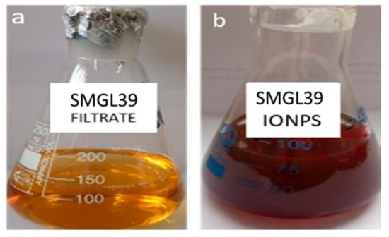 Screening of the isolated bacterial strain ability to biosynthesize iron oxide nanoparticles was carried out according to Mohamed et al., with slight a modification of their procedure. A solution of 3 mM ferrous sulfate was prepared by dissolving 0.417 g of FeSO4.7H2O powder in 500 mL of distilled water. The cell-free extracts of the five actinomycetes strains were mixed with ferrous sulfate solution in a mass ratio of 2:5, respectively. The pH should then be adjusted to 11, which is the suitable pH for actinomycetes to produce iron oxide nanoparticles. After that, the mixtures of ferrous sulfate and actinomycetes extracts were then incubated for 48 h at an appropriate temperature. Solutions underwent a color shift from bright yellow to dark brown, signifying the efficient production of iron oxide nanoparticles from actinomycetes [].