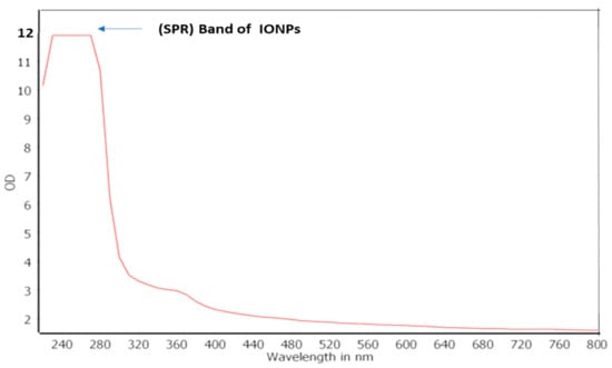 The spectra recorded from the FeNPs solution showed an absorbance peak at 220–280 nm, which is specific for the iron oxide nanoparticles (Figure 5).