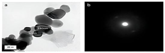 The transmission electron microscopy (TEM) analysis of the biosynthesized iron oxide nanoparticles (FeNPs) revealed polydisperse morphology, exhibiting a range of sizes between 80 and 180 nanometers (Figure 6a,b). The micrograph provided detailed insights into the size distribution and structural characteristics of the FeNPs, demonstrating the variety of particle forms in this size range. The polydispersed forms of the produced nanoparticles indicate the heterogeneous production process, highlighting the need to understand the biosynthetic processes that produce iron oxide nanoparticles with various sizes and shapes. The detailed TEM analysis significantly enhances a general understanding of the biosynthesis of FeNPs and their potential uses in different fields.