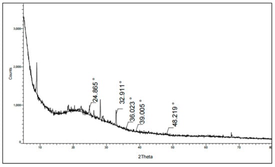 X-ray diffraction (XRD) is considered one of the most important characterization techniques to study the structural and morphological properties of nanomaterials. Herein, the biosynthesized nanoparticles were examined via the XRD diffraction pattern, as shown in Figure 7. The XRD pattern of the biosynthesized FeNPs was detected at 24.8, 32.9, 36.02, 39.00, and 48.21 which is strongly similar to previously reported nanoparticles.