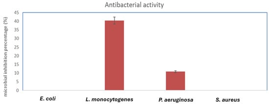 Moreover, Batool and associates assessed the antibacterial efficacy of the green synthesized iron nanoparticles by Phoenix dactylifera extract against a variety of bacterial species and determined the maximal zone of inhibition against E. coli []. Research remains in progress to determine the mechanism of action with regard to the controversy related to the antibacterial characteristics of FeNPs. Several studies have produced contradictory results, with some demonstrating efficacy against E. coli and others showing no activity against this pathogen [,]. According to a study by Mohamed et al. (2015), iron nanoparticles cause oxidative damage to the bacterial cell wall; they exhibit antibacterial action against both Gram-positive and Gram-negative bacteria tested in their work. Bacillus subtilis is more susceptible to the antimicrobial effects of iron nanoparticles than E. coli and S. aureus []. The MIC of the biosynthesized iron oxide nanoparticles was measured toward the most susceptible pathogenic microbes, L. monocytogenes with MIC (125 µg/mL) and Fusarium oxysporum (62.25 µg/mL).