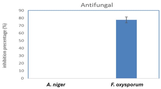 Iron oxide nanoparticles significantly reduced the growth of Fusarium oxysporum microorganisms by 77.75%. This finding implies the effectiveness of the nanoparticles against this specific fungus. Similarly, iron oxide nanoparticles demonstrated moderate inhibitory activity against L. monocytogenes (ATCC 7644), resulting in a significant reduction in microbial growth by 40.42%. This indicates that these nanoparticles could be an effective choice for fighting the pathogenic bacteria L. monocytogenes, as they may have a bacteriostatic effect on it. Another bacterium that iron oxide nanoparticles successfully targeted was P. aeruginosa (ATCC 90902), which led to a 10.84% decrease in microbial growth (Figure 9). This demonstrates the capacity of the nanoparticles to prevent P. aeruginosa from growing, which is noted for its resistance to numerous traditional antibiotics. However, FeNPs showed no growth inhibition against E. coli (ATCC 8739), MRSA, and Aspergillus niger, highlighting their limited antibacterial effectiveness against these bacterial and fungal strains (Figure 9 and Figure 10).