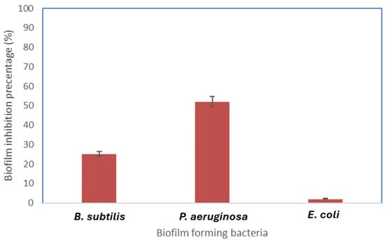 FeNPs’ inhibition of biofilm formation against B. subtilis, P. aeruginosa, and E. coli.