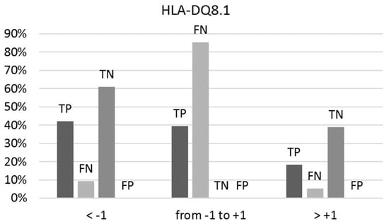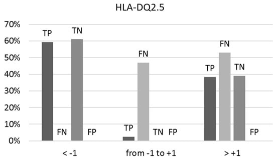 Here again, like the predictions for HLA-DQ2.5, uncertainty in prediction intensifies when both the BS/NBS and NBS/BS ratios approximate unity (between −1 and +1). Among the true positives, 40% show a BS/NBS ratio within this range, while 85% of the false negatives are within this range (Figure 3). All true negatives consistently present an NBS/BS ratio below −1, and no instances of false positives have been observed.
