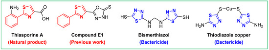 Structural optimization based on natural products has been an important way to discover novel pesticides, which is of great significance to delay the development of resistance and enhance pharmacodynamic effects [13,14]. Thiasporine A (Figure 1) is a heterocyclic natural product initially isolated from marine-derived Actinomycetospora chlora SNC-032 by MacMillan in 2015 [15]. In our previous work, we synthesized several series of thiasporine A derivatives with potent antifungal activity and demonstrated that phenylthiazole was a promising antifungal activity skeleton [16]. Notably, Shi [17] introduced an 1,3,4-oxadiazole thione into phenylthiazole to synthesize compound E1 (Figure 1), exhibiting the most excellent antifungal activity against S. sclerotiorum with an EC50 value of 0.22 μg/mL, which was superior to that of the commercial fungicide Carbendazim (EC50 = 0.70 μg/mL). Regrettably, compound E1 did not perform excellent antibacterial activity, but this result provides valuable guidance for carrying out subsequent molecular design.