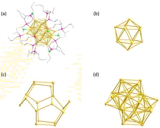 The geometrically closed equivalents of 1 are the Au32 clusters. The inner shell of the Au32 cluster is also a hollow Au12 icosahedron (Figure 2a), but the outer shell differs from 1 by two additional gold atoms, resulting in a Au20 pentagonal dodecahedron (Figure 2b). Three different Au32 clusters are known and can be synthesized from the reduction of phosphine-stabilized gold chlorides, (R3P)AuCl, in which the phosphine ligands are substituted with linear alkyls (R = Et, nPr, nBu) [25].