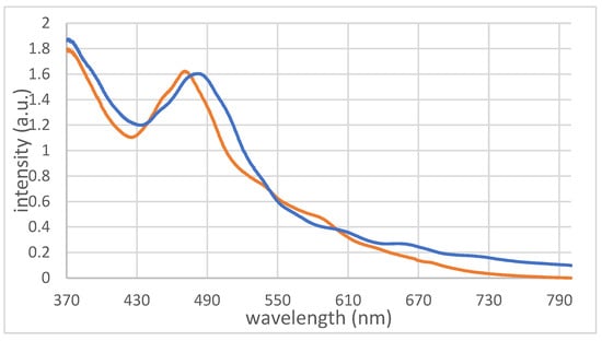 The close structural relationship between compounds 1 and 3 is also demonstrated by their UV/Vis spectra (Figure 4). Compound 1 displays a significant absorption band at 471 nm, with shoulders at 452 nm, 493 nm, 540 nm, 587 nm, and 637 nm (orange). Likewise, 3 presents a strong absorption band at 482 nm with several smaller bands and shoulders (blue). The UV/Vis spectra of the three different Au32 clusters are almost the same, since the influence of the ligand on the electronic situation of the nucleus is small. The absorption of 1 appears analogous to that of compound 3; however, blue shifted by 10 nm. Such small shifts in similar clusters were also observed for the [Au25(SCH2Ph)18]- cluster which revealed minimal differences in the UV/Vis spectra when compared with both the neutral species and doped cluster compounds, such as Au24Pt or Au24Hg [17].