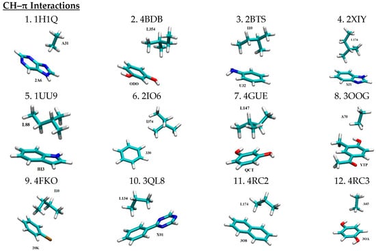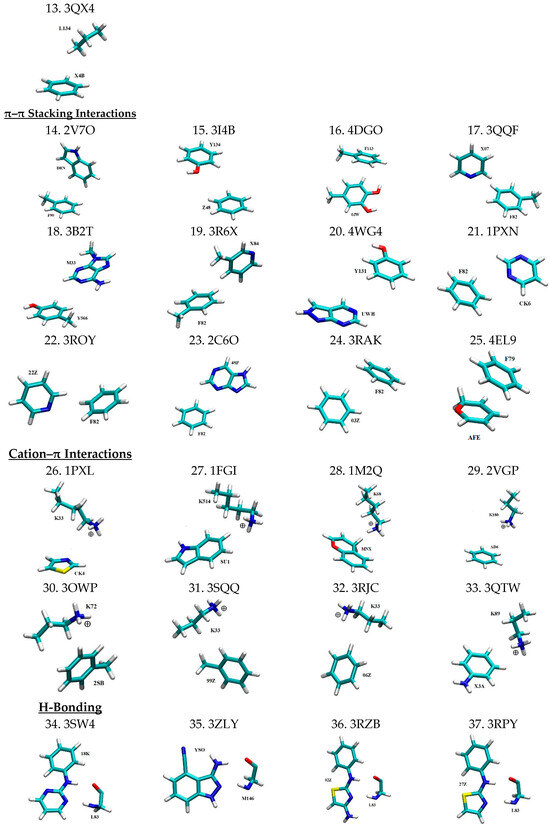 In order to construct a comprehensive library of three-dimensional (3D) binding motifs to model the interactions between PKIs and protein kinases, we meticulously selected representative motifs of pairwise nonbonded interactions between PKIs and their interacting residues inside the ATP binding pocket of protein kinases. In a previous study, we carried out a large-scale data mining of the PDB, which resulted in the establishment of a database of 2139 non-redundant high-resolution X-ray crystal structures of kinase–inhibitor complexes [6]. Based on this database, 49 unique motifs of nonbonded interaction pairs between PKIs and their interacting residues were extracted. These represent key modes of nonbonded interactions, including 13 CH–π interactions, 12 π–π stacking interactions, 8 cation–π interactions, 8 hydrogen bonding, and 8 salt bridge interactions. The selection of these motifs was governed by two main criteria. The first criterion prioritizes protein kinases that are the targets of disease treatment. For example, multiple cyclin-dependent kinases (CDKs) were included, owing to their crucial role in cell cycle regulation and their status as high-priority targets for kinase inhibitor development. The second criterion ensures that these 49 motifs comprehensively cover the diverse spectrum of possible intermolecular interactions, such as hydrogen bonding, salt bridge, and all non-bonded π-interactions, in proportion to their occurrence frequencies in the database of 2139 PKI-Protein complexes [6].