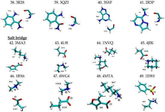 Three dimensional structures for all 49 motifs of nonbonded interaction pairs between PKIs and their interacting residues are depicted in Figure 1 in the same motif count order as in Table 1. The four letter codes after the motif count represent the PDB IDs for the PKI bound complexes from which the binding motifs are extracted. For each binding motif, the PKI and its interacting residue are labeled by the three-letter ligand ID and the residue ID number of the corresponding PDB file, respectively. Given the large size of PKI molecules, only the functional group of a given PKI that directly interacts with the protein was kept as part of the 3D motif. The coordinates of all the non-hydrogen atoms were extracted from their respective PDB files. Hydrogen atoms were patched to satisfy the valency by means of a geometry optimization calculation at the HF/6-31+G levels using the Gaussian 09 program [64]. It should be cautioned that the X-ray crystal structures from which the motifs were extracted may potentially have been distorted by crystal packing. However, the extent of such distortion is a matter of hot debate, with some seeing it as minor adjustments while others view it as significant.