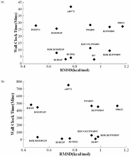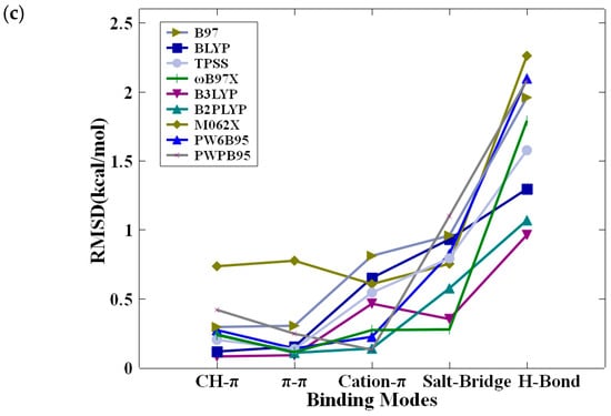 Based on the gas phase interaction energies of 49 motifs of nonbonded interactions calculated at the CCSD(T)/CBS level above, the performance of BLYP, TPSS, B97, ωB97X, B3LYP, M062X, PW6B95, B2PLYP and PWPB95 functionals was benchmarked. As shown in Table 3, these nine exchange-correction functionals span the entire spectrum of the Jacob’s ladder, featuring two (meta-)GGAs, five (meta-)hybrid functionals, and two double-hybrid functionals. Given the dual objectives of our performance benchmarking, i.e., accuracy and efficiency (see the Introduction section), different algorithms of implementation for several functionals are also evaluated. For functionals BLYP, TPSS, B97, B2PLYP, and PWPB95, the Resolution of Identity (RI) approximation (also called Density Fitting) [70] is implemented. In addition, the PW6B95 functional is implemented with the RIJCOSX approximation that uses density fitting for the Coulomb (J) integrals and numerical chain-of-sphere integration for the HF Exchange integrals (COSX) [71]. For efficiency, B2PLYP and PWPB95 functionals were also implemented with the resolution of identity (RI) approximation for the perturbation step and RIJK (RI approximation is applied to both Coulomb and HF Exchange integrals) [72] for the HF-SCF step. Basis set dependence was also studied systematically. For this purpose, the Ahlrichs def2 basis set family [31,73] was employed, including def2-SVP (split valence), def2-TZVP (triple zeta valence), and def2-QZVP (quadruple zeta valence).