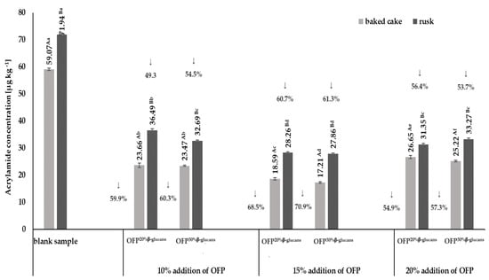 Changes in the acrylamide concentration in baked cakes and rusks depending on the type and concentration of the oat fiber preparation in the recipe composition. Blank sample-dough without the addition of an oat fiber preparation; OFP20% β-glucans-oat fiber preparation with a 20% β-glucans content; OFP30% β-glucans-oat fiber preparation with a 30% β-glucans content; uppercase letters-different letters within the same row indicate significant differences in the acrylamide concentration depending on the type of product (baked cake or rusk) for a given concentration of fiber preparation (n = 3; p ≤ 0.05); lowercase letters—different letters within the same row indicate significant differences in the acrylamide concentration depending on the concentration of the added fiber preparation for a given type of product (baked cake or rusk) (n = 3; p ≤ 0.05); data are presented as the mean ± SD.